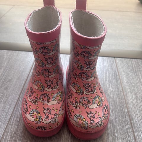 Söta ofodrade gummistövlar storlek 22. Fint använt skick, hela. Med blommor och regnbågar på.