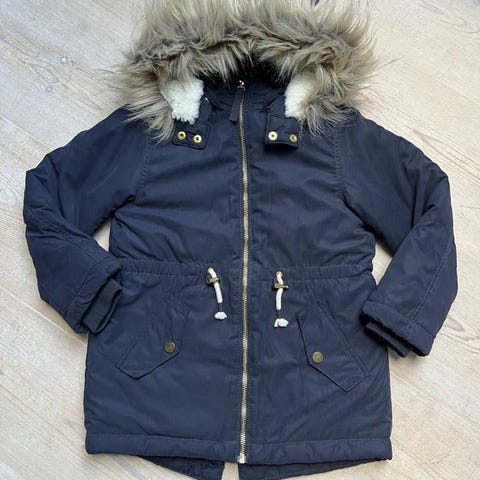 Svart jacka HM stl.164 i fint skick. Inte använd många gånger. Vadderad parkas i vävt material med ståkrage och avtagbar, fodrad huva med fuskpälskant. Dragkedja framtill med hakskydd, dragsko i midjan, handvärmarfickor upptill, framfickor. Teddyfoder upptill och quiltfoder under.