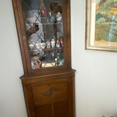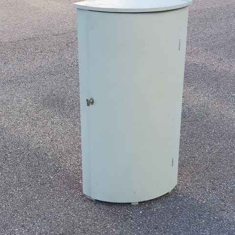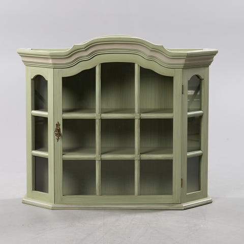 Skåpet är målat i två nyanser av blått. Det har en vitrinskåpsdel med glas i dörren, vilket gör det lämpligt för förvaring och visning av föremål.