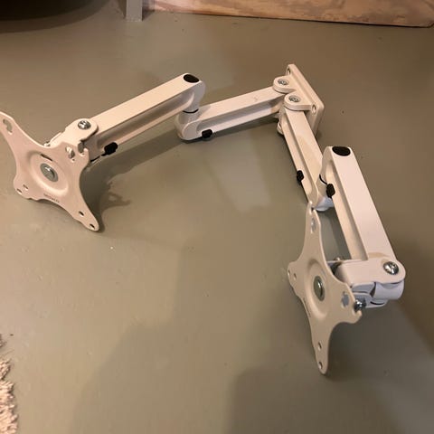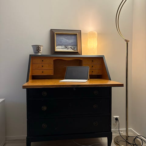 Minimalistiskt väggmonterat fällbart skrivbord - väggskåp till hemmakontoret. Tillverkat i lackad björkplywood med linolium på skrivbordyta. Möjligt att montera för två olika höjder för ståhöjd samt normal skrivbordhöjd. Egentillverkat då jag inte kunnat hitta något liknande. Mått b=880mm h=630mm d=170mm för 34 tums skärm. Tillverkas mot beställning. Kan tillverkas i andra storlekar också.