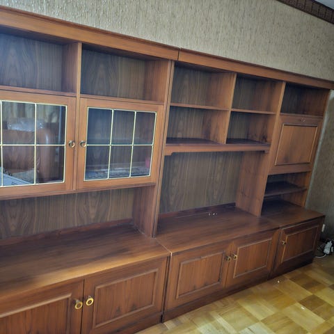 Högkvalitativ, vacker högskåp, grå med valnötsdetaljer, fotmanövrerad belysning, gott om förvaringsutrymme, 2 rymliga lådor, perfekt för vardagsrum eller matsal, utmärkt kvalitet
