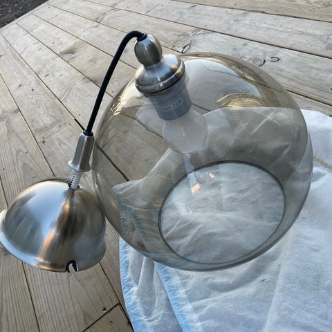 Fin lampa som ger nedriktad belysning över tex ett runt matbord. Vi har målat om den i denna klar-röda ton. Vit insida.