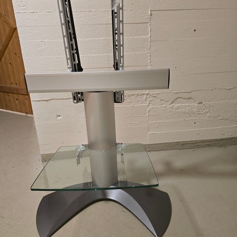 Ett rejält och mycket stadigt tv-stativ som använts till en 65"-tv. Har själv använt det utan de medföljande hyllorna (som på bilden ligger på golvet) men de kan enkelt monteras dit.