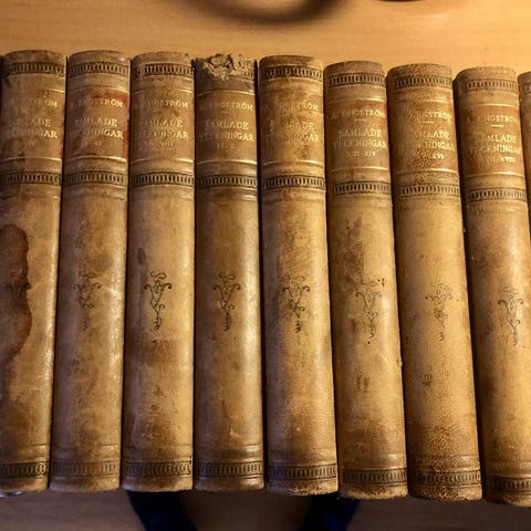 Sex böcker i fint skick från 1931. Inbundna med brun skinnrygg. Johan Ludvig Runebergs ”Samlade arbeten I-VI” .