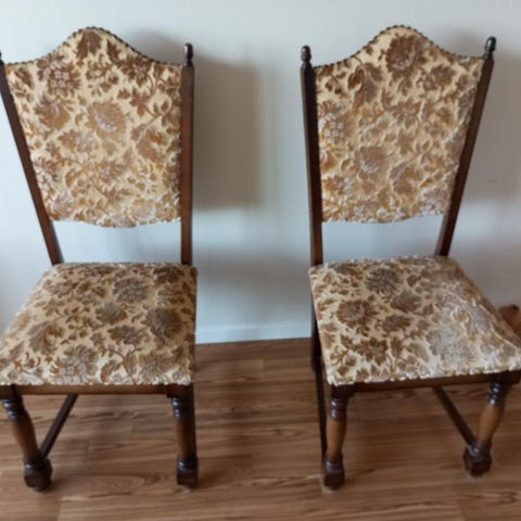 Skuren, dekorativ trädekor i valnöt. Klädda sitsar. Gott skick.