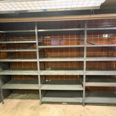 Tidningsställ med 12 plastfack på OSB skiva.