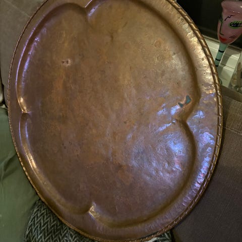 Säljer en vacker metallbricka med handmålat blomstermotiv.