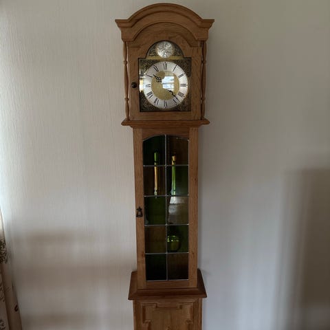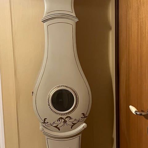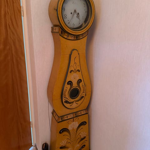 Ett fint antikt golvur i gustaviansk stil, ca 150 år gammalt. Den är vit med fina gulddetaljer. Själva klockan är ur funktion men går att laga. Har någon spricka i färgen som syns i bilderna.
