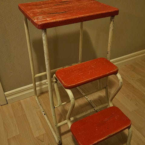 Bredd nedersta steget ca 44 cm och översta steget 28 cm brett.