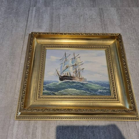 En vacker tavla med ett landskapsmotiv. Den föreställer en stilla sjö med en fiskare vid strandkanten, omgiven av träd och grönska. Tavlan är inramad.