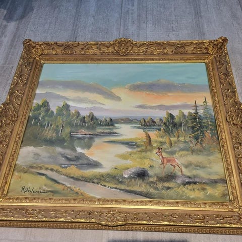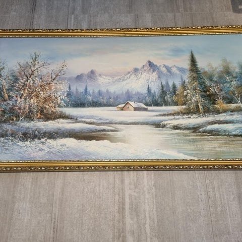 En vacker tavla med ett landskapsmotiv. Den har en guldfärgad ram som kompletterar motivet.