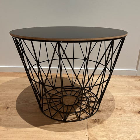 Ferm living wire basket säljes. Sparsamt använd. Den är pulverlackerad i svart med en skiva i svart laminat. B.50 cm - H. 40 cm