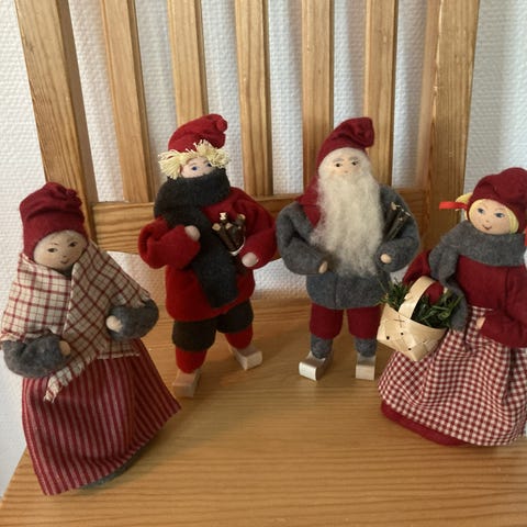 Jag har gjort en tomte som just nu är en påskkärring, relativt enkelt att byta kläder på den. Den är gjord av metalltråd, ca 170 lång. Det följer med masker, kläder, kvast, kaffepanna, katt. Dock inte kängorna på tomten. Finns i Odensala Östersund.