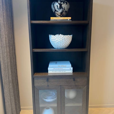 Elegant grå klädsel och stort förvaringsutrymme. Stabil och hög kvalitet.