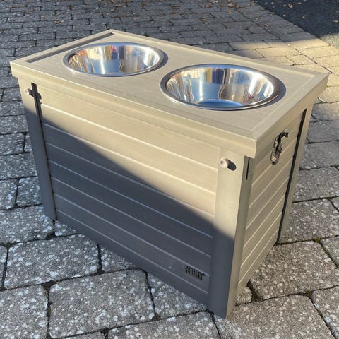 Egengjord matbar med två stora rostfria skålar. Passar större hund.