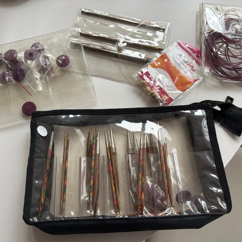 Sex stycken stickramar, två stickkrokar och två avslutningsnålar, säljes som ett paket. Bästa garnstorleken är för stickor runt 7mm. Det är enkelt att sticka vanligt med de här, och nästan lika lätt att göra avancerad stickning som brioche, rutor, och spiralmössor.