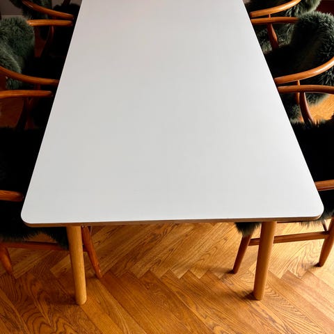 Den rektangulära varianten i Svalan-serien bjuder på mest yta och passar dig med rymliga utrymmen och många matglada gäster. Iläggsskivan är lite lätt kantstött annars är bordet i toppenskick!