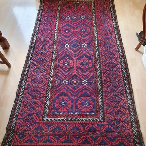 En orientalisk matta med detaljerade mönster och färger. Mattan har en röd bottenfärg med inslag av blått, gult och beige. Perfekt för att ge rummet en varm och inbjudande känsla.