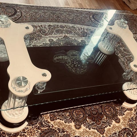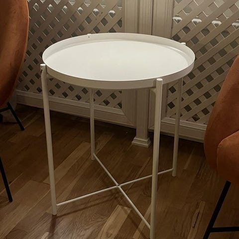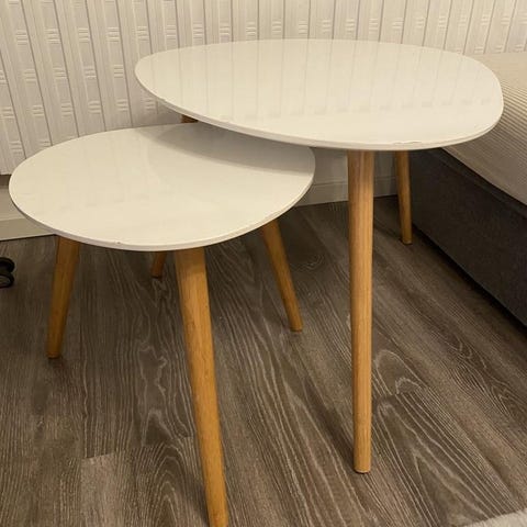 Säljer två stilrena brickbord i klassisk butler tray-stil – ett större ovalt bord och ett mindre runt. Båda är stabila, charmiga och passar perfekt som soffbord, sidobord eller ett flexibelt serveringsbord.