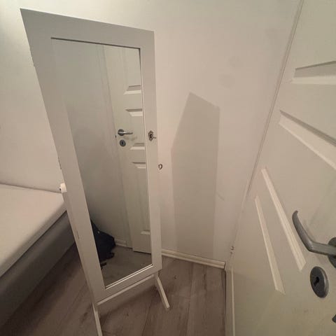 Svart smyckesskåp med spegel. Skåpet kan öppnas och har förvaring för smycken. Lås med nyckel finns.