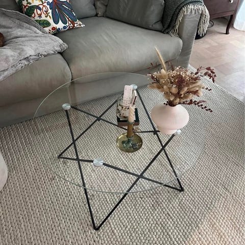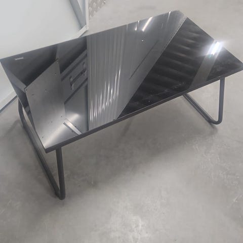 Fint svart soffbord med metallunderrede, träskiva på botten och översta skivan i härdat glas. Väldigt enkel att rengöra.