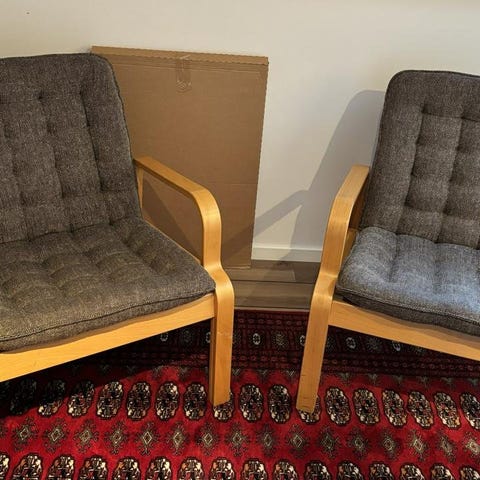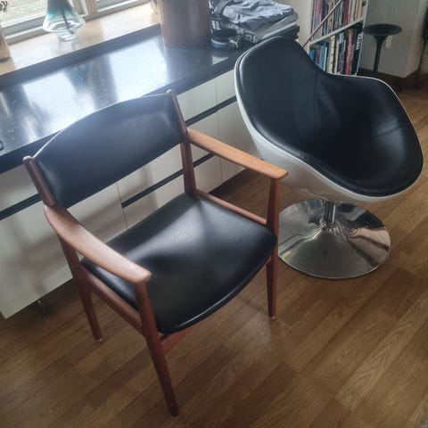 Stil: Fåtöljerna har en tydlig retro- eller mid-century modern stil, kännetecknad av den exponerade träramen och den formade, stoppade sitsen och ryggstödet.