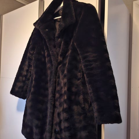 Svart kappa i persianpäls för dam i storlek 38. Lång modell med strukturerad pälsyta och krage. Fodrad insida för ökad komfort. Passar som ytterplagg under kallare säsonger.