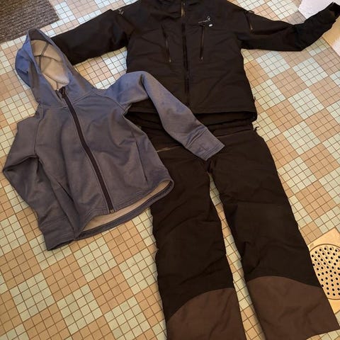 Jättefint vinterställ med snölås och smarta fickor bl.a. liftkortsficka. Även luftningsmöjlighet. Liten lagning av reva i yttertyget nere på ena benet. I övrigt sparsamt använt, inga tecken på slitage.