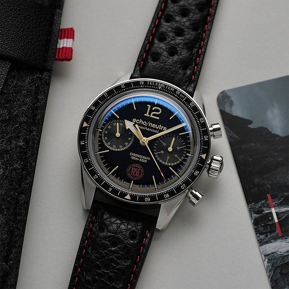 Den räfflade vridringen, som är ett typiskt stildrag hos en Hanhart, roterar kontinuerligt i båda riktningarna. Positionsmarkören på Moby Dick är dock inte röd, utan matchar urtavlans färg. Precis som resten av designen påminner detaljerna på urtavlan om den historiska modellen från 1950-talet med blånerade visare.