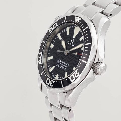 Klocka från Omega Pre-Owned. En begagnad Omega Seamaster Planet Ocean, samma modell som burits av James Bond. Med sin robusta boett, länk i stål, lysande markeringar och en vattentålighet på 600 meter är klockan en perfekt följeslagare på dykäventyr.