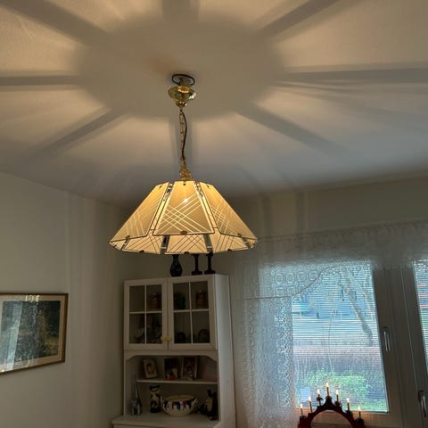 Fin äldre taklampa som ger fint sken i porslin/alabaster