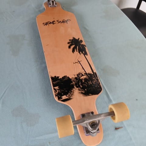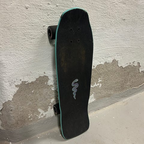 Har mestadels hängt på väggen sedan inköp, och är aldrig rullad utomhus. Komplett som den såldes i butik. Nypris var ca 3000:- och brädan säljs inte längre vad jag vet. Griptapen blev lite sliten vid nån flytt då den låg grippa mot grippa med en annan bräda. :)