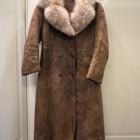 En jättefin vintage-kappa från NK / Nordiska Kompaniet. Kappan är ljusbrun / beige, och har fuskpäls i nederkant och ärmslut. Den har ingen storleksangivelse men jag bedömmer den till storlek 40-42. (Se mått nedan.) Kappan knäpps med tryckknappar, har sidfickor och kragen/slaget kan has på två olika sätt, vilket du ser på en av bilderna. Kappan är i väldigt fint skick anser jag, med tanke på åldern. Det finns några sömmar som har gått upp lite grann på innerfodret och en liten skada på yttertyget. Allt det ser du på sista bilden. Titta noga på bilderna för egen bedömning innan köp.
