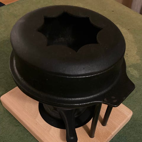 Foundygryta gjutjärn på träplatta. 6 st foundypinnar