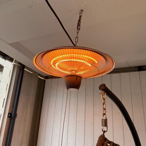 Två stycken terrassvärmare med bluetooth högtalare och fjärrkontroll 1800W i silver. Terrassvärmare till altan som du fäster i taket. Du kan när som helst sätta på värmen och samtidigt lyssna på musik. Frostat halogenrör och dubblavärmelampor.