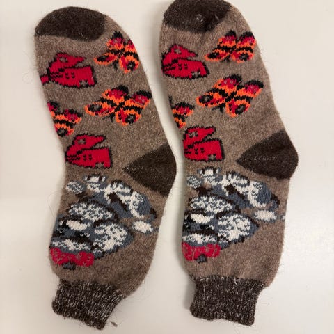 Jättefina, aldrig använda mönstrade ullsockor i traditionell design.