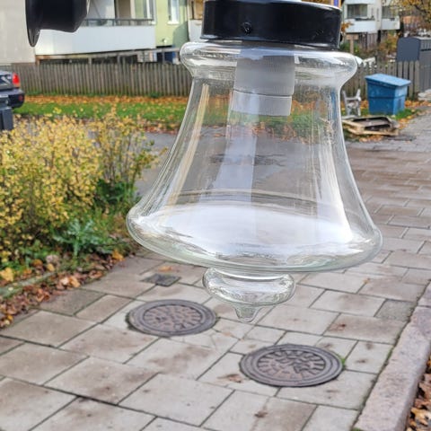 Säljer en klassisk utomhuslampa från 50-talet med porslinsfäste och original kupa i opalglas.