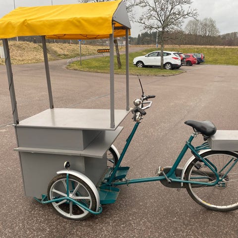 Cykelvagn från Sunbee modell cruiser 2-sitsig kan enkelt göras om till promenadvagn med hjälp av de löstagbara framhjulet. Dragstängen fälls in under vagnen.