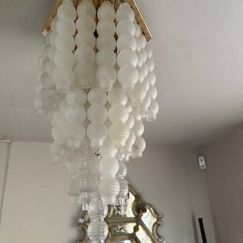 En otroligt vacker lampa! Designad av Gino Vistosi, 1970, Murano glas. Han var en banbrytande italiensk formgivare, känd för sitt innovativa arbete med munblåst glas inom belysningsdesign. Under 60- och 70-talen skapade han flera ikoniska modeller, ofta i samarbete med den italienska glasproducenten Vistosi. Hans arbete kännetecknas av tidlös formgivning och högkvalitativa material, något som gjort hans lampor mycket eftertraktade på andrahandsmarknaden idag. Lampan tillhör den så kallade Dischi-serien, där varje glasdel har formen av en rund, platt glaskiva – precis som namnet antyder ("dischi" betyder "skivor" på italienska).