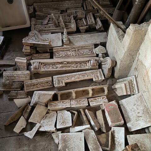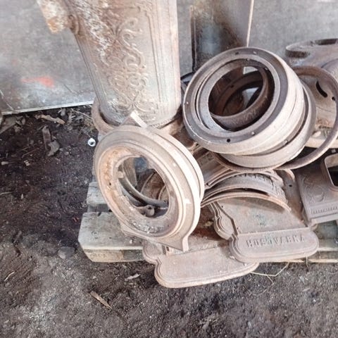 Delar till en äldre kakelugn. Några delar kanske saknas.