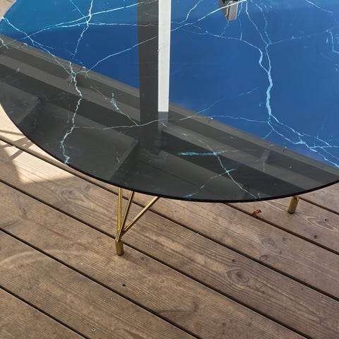 2 st soffbord med skiva i glas och marmormönster, ben i mässingsfärg. Stora bordet är ca 80 cm i diameter och ca 44 cm högt. Lilla bordet är ca 55 cm i diameter och ca 40 cm högt