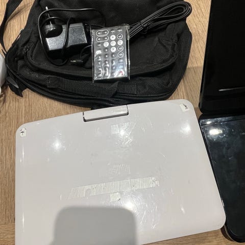DMTECH PDV‑895‑2 bärbar DVD-spelare med TFT LCD-skärm, fjärrkontroll och kablar.