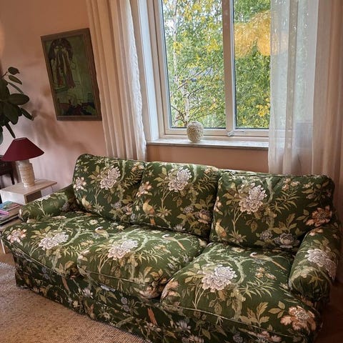 Fin soffa från Tine K, hela serien finns kvar om man önskar komplettera med fåtöljer och soffor. Det går även att köpa nya överdrag. Soffan är idag i en mörkgrå velvet.