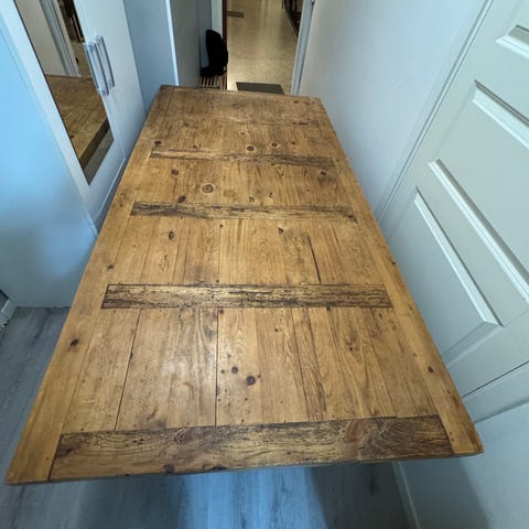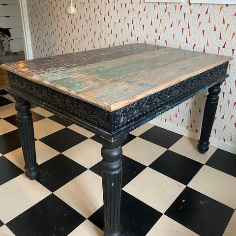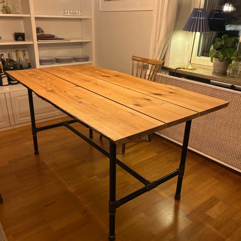 Bredd 120 cm längd 120 till som mest 350 cm. Totalt 4 iläggsskivor vilket gör bordet flexibelt.