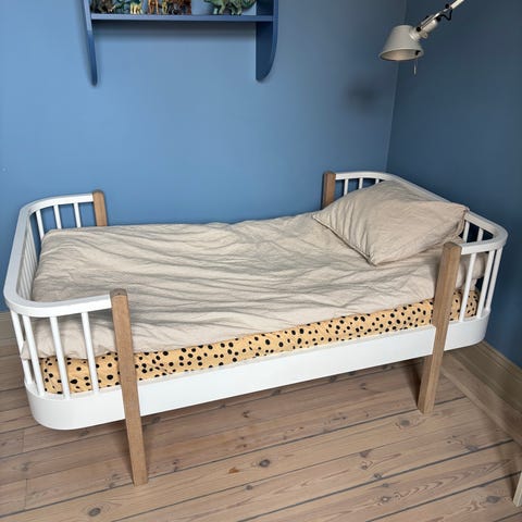 Vit dagbädd/säng från danska Oliver Furniture som passar bra för alla barn. Den låga höjden gör det enkelt för barn från omkring tvåårsåldern att själva klättra i och ur sängen vilket minskar behov av en juniorsäng mellan spjälsäng och fullstor. Inkluderar praktisk sänglåda.