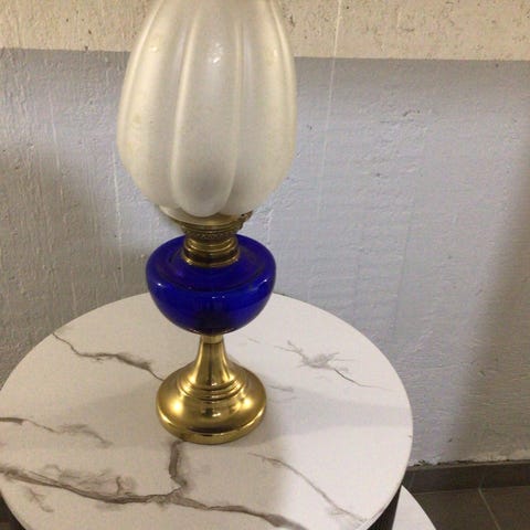 Enkel. Fotogen behållare 16 centimeter i diameter. Fotogen behållaren är i klarglas blå. 400:-