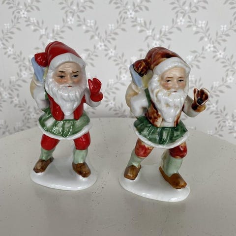 Fina keramiktomtar. En liten nagg längst ned på en av småtomtarna, se bild. Den stora tomten är 11,5 cm hög och småtomtarna är cirka 5 cm höga.