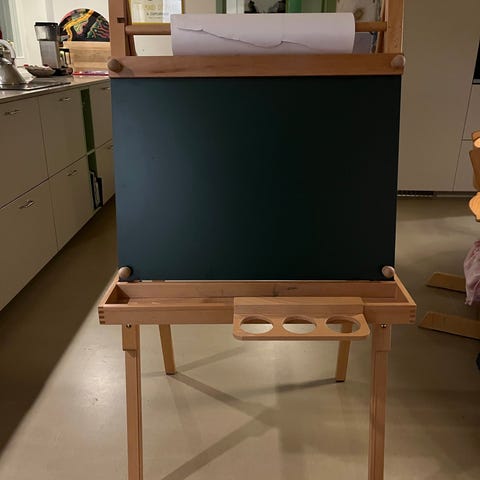 Ett litet dubbelsidigt, ihopfällbart staffli med en pappersrulle, stöd för pappersrulle samt blackboard för kritor. En behållare där man kan lägga pennor m.m. 110x48