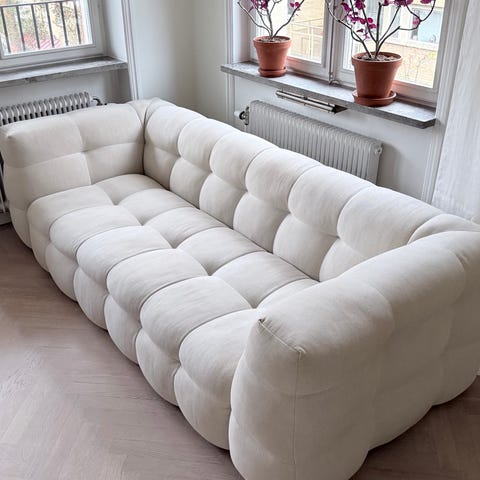 Säljer nu vår otroligt fina och trendiga soffa inköpt på Sleepo på grund av flytt utomlands. Soffan är klädd i ett mjukt och slitstarkt teddytyg (bouclé) i en vacker off-white/krämvit nyans. Den har en modern design med bulliga former som ger rummet en lyxig och ombonad känsla.