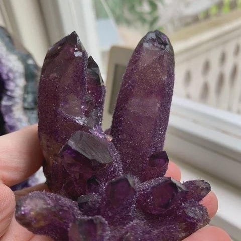 A magical, nice raw amethyst cave with a decent depth. It can stand or lie down, looks like a bowl lying down. It also has crystal formations like roses in it. It is a little lighter purple than the pictures show 💜🌲